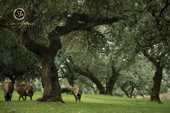 一只伊比利亚黑猪,要在广阔的橡树林地里优哉游哉地放养几个月,每天心情愉悦地睡觉、晒太阳和吃橡果,无限repeat,才有资格被做成顶级的橡果火腿(Bellota)。