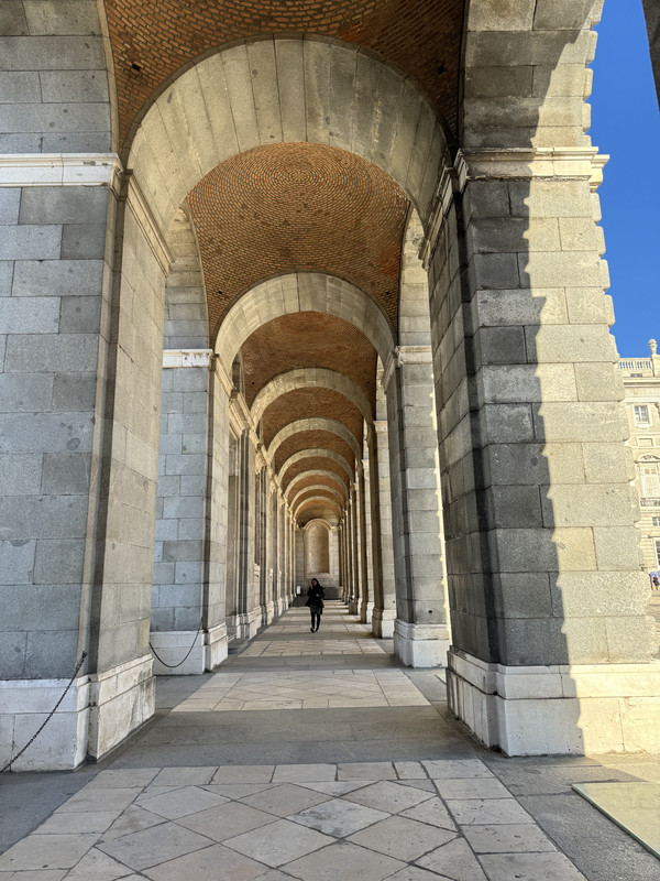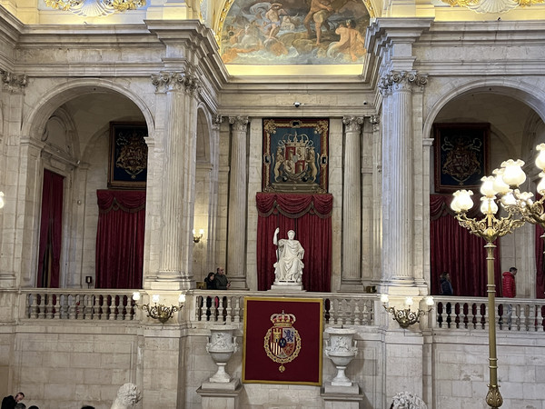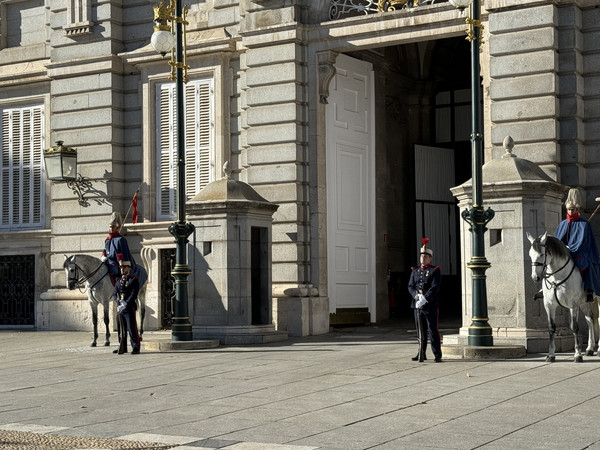 马德里王宫是仅次于凡尔赛宫和维也纳皇宫的欧洲第三大皇宫。快接近王宫正门时,看到很多人在等候,没等几分钟,12点整卫兵换岗仪式开始了。手持长枪、脚蹬筒靴、腿跨大马……异域风情中展示着满腔自豪。参与换岗仪式的骏马踏着整齐的步伐好像能听懂军乐的节奏,几乎每一下马蹄都踏在军鼓的点子上。