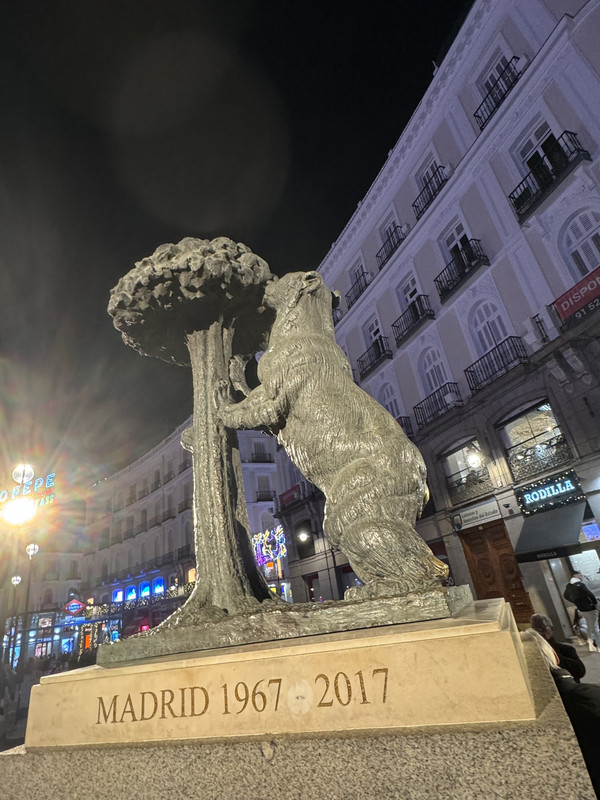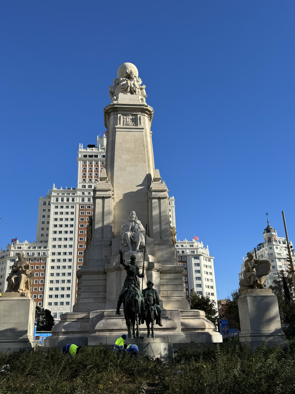 马德里有大大小小的广场,最知名的就是太阳门Sol广场和Mayor马约尔广场。正值圣诞季,不论白天晚上,路上人山人海,圣诞布置连绵不绝,老公说很久没看到这么多人在逛街的热闹景象了。最热闹的还是太阳门广场,位于西班牙公路的零公里起点处,广场上著名的熊和树莓雕塑是马德里的市徽,也是马德里的标志之一。去王宫的路上,我们经过了西班牙广场。广场建有塞万提斯纪念碑和唐吉诃德塑像。唐吉诃德骑着他的瘦马,仆人桑丘骑着毛驴紧跟其后。