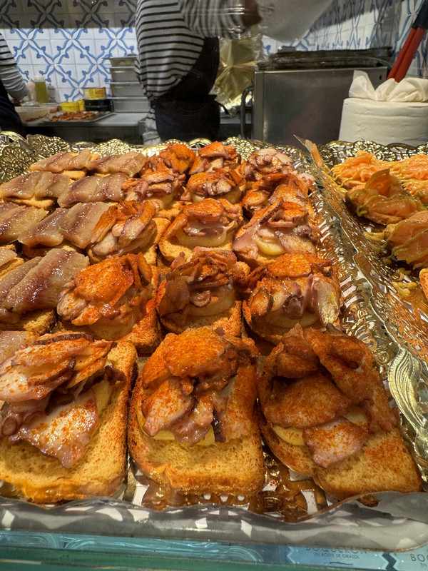王宫出来后,我们步行到圣米格尔市场。这是马德里著名的美食市场,离西班牙广场1公里多,步行十几分钟就可以到。它是一个钢铁+玻璃的大房子,占地1200平方米,市场经翻新后于2009年开放。里面有许多摊位和吧台,可以边买边吃。当我们买好了东西靠着玻璃墙边的吧台吃饭时,突然一阵妖风把对面饭店的太阳伞吹倒了,树叶在空中盘旋久久不掉下来。三个壮实的年青人费力地扶起伞,希望可以把它移开。