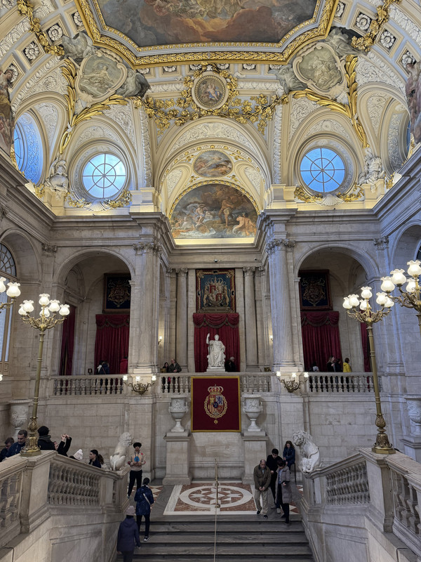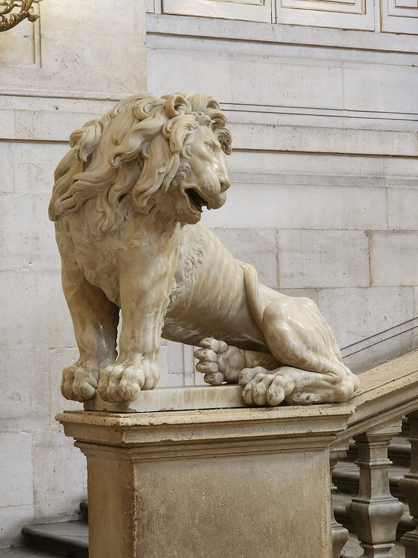 王宫整个格局呈方形,正门前是名为“兵器广场”的一个广场,气势恢宏。王宫内部珍藏了不计其数的金银器皿、乐器、壁毯、绘画雕塑和皇室用品。瓷器厅、帝王厅和餐厅等等都是历代国王按照自己的喜好修建而成,带着浓厚的个人色彩。虽然风格迥异,但都富丽堂皇、极尽奢华。王宫最精华部分无法用拍照留念,是实乃遗憾。西班牙王宫的石狮子,蠢萌蠢萌的。