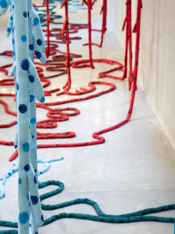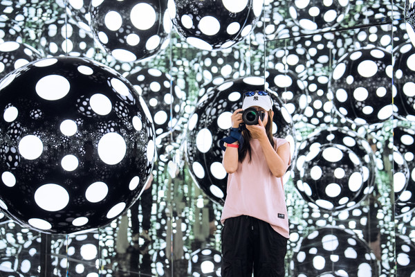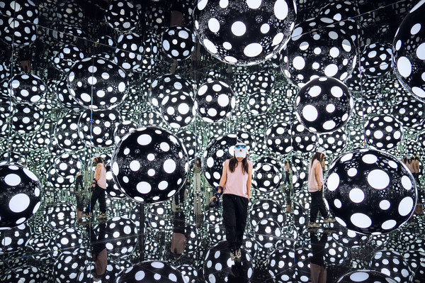 现在B2草间弥生《圆点执念——渴望天堂的爱》特展,有别于平日看到的高彩度对比的圆点花纹,这次采用黑白两色大量包覆墙壁、地板,加上镜子的折射仿佛置身于一个魔幻的世界中。在无穷无尽的圆点中混淆了真实空间的存在,只有阵阵眩晕和不知身处何处的迷惑,营造出一种无限延伸的空间,置身其中,真实世界与幻境之间似乎都没那么重要了。