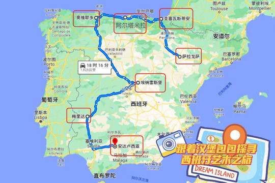 最后附上一张行程地图,大家可以选择乘坐西班牙国铁或者自驾游玩这7个地方,推荐每个目的地逗留1、2天,总行程大概2周就可以走完这条西班牙艺术之路了。
