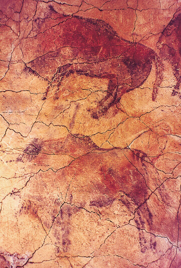 1875年,一位研究史前的考古学家马塞利诺·德·梭杜乌尔的小女儿玛丽亚,偶尔看到了洞窟里的绘画。据考古学家考察发现,这个阿尔塔米拉大洞穴中存世有二十多种旧石器时代的动物形象,包括十五头野牛、三只野猪、三只母鹿、两匹马和一只狼。其中的一头野牛是最早被发现的,它被画在主洞的窟顶上,已有2万多年的历史,它属于旧石器时代的晚期,即马德林文化时期的中期。画中野牛以赭红、黑、褐等颜色画出,形象生动而准确。