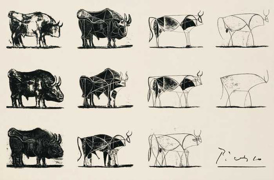 在他笔下的牛从复杂到简单,最后化为简单的寥寥几笔就把牛的轮廓描绘得出来,它很像在西班牙北部阿尔塔米拉的公牛,据说当年在参观该洞穴后毕加索说了一句名言:"我们什么都没发明!"