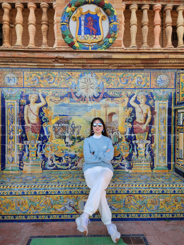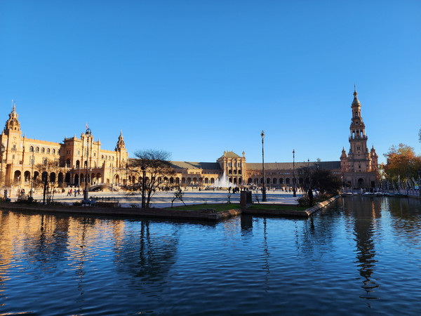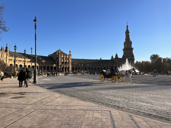 那天的路真的走太多了,又走了半小时左右就来到玛利亚·路易莎公园中的塞维利亚的西班牙广场。我们在傍晚前到的,正是太阳慢慢下山光线变换的时刻。眼前的西班牙广场色彩缤纷,随意一拍都是油画般的大片。移步换景,可以看到新月形弧度的优雅回廊以及广场的小桥流水,伴着夕阳的余晖。整个西班牙那么多西班牙广场,属塞维利亚的最好。当然,令人印象深刻地还有无处不在的复古马车,嘚嘚的马车,特别有一种穿越回几百年的感觉。马蹄的踢踏声和伴随着马粪的味道如影随行。