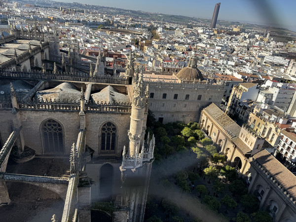 吉拉尔达塔也是塞维利亚大教堂的亮点之一,为当摩尔人统治时建造的清真寺塔楼,高98米,沿着略为陡峭的楼梯登至塔顶可一览塞维利亚城风光。三个人31欧元,用了学生卡,包换上塔。融合了两种风格的希拉达塔,代表着伊斯兰与基督教两种文明的交汇。努力爬上数不清的坡道与楼梯,但这点付出是值得的,到了顶部可以看到塞维利亚的风景全貌,以及远处朦胧的轮廓。