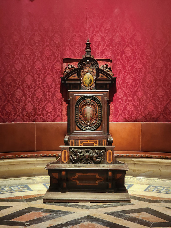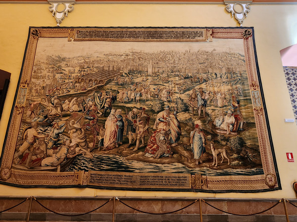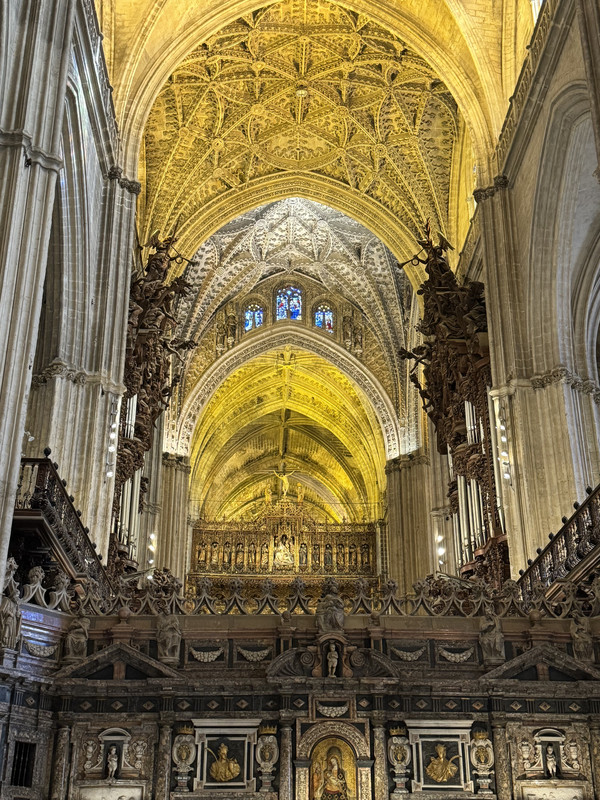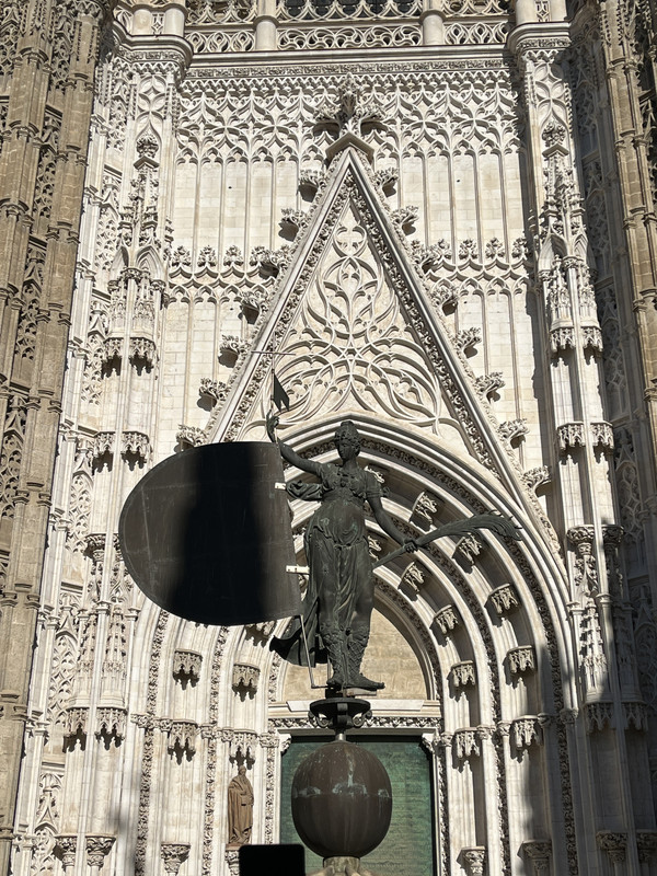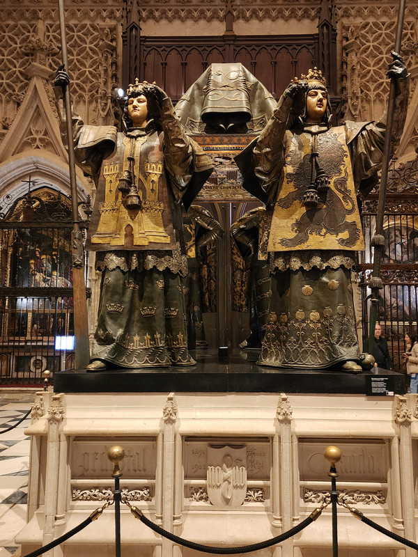 王宫对面就是教堂,三个人门票31欧。进入塞维利亚大教堂是需要安检的。这也是我们第一次遇到教堂也要安检。这里是是伊斯兰教与基督教双重宗教艺术的产物。哥伦布的灵柩1898年由古巴运回西班牙后,埋葬在教堂中的哥伦布墓。由卡斯蒂利亚、莱昂、纳瓦拉、阿拉贡四位国王骑士雕像扛起,表达了对哥伦布至高的敬意。