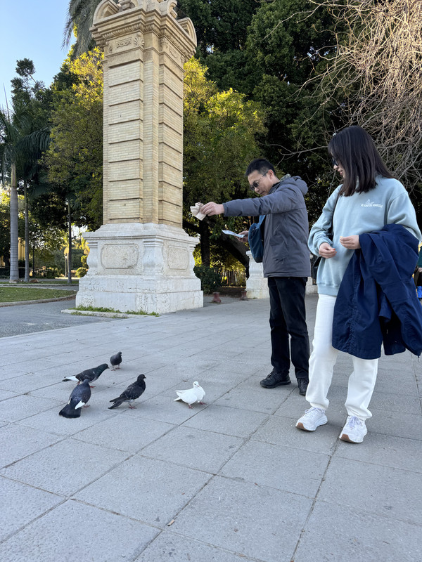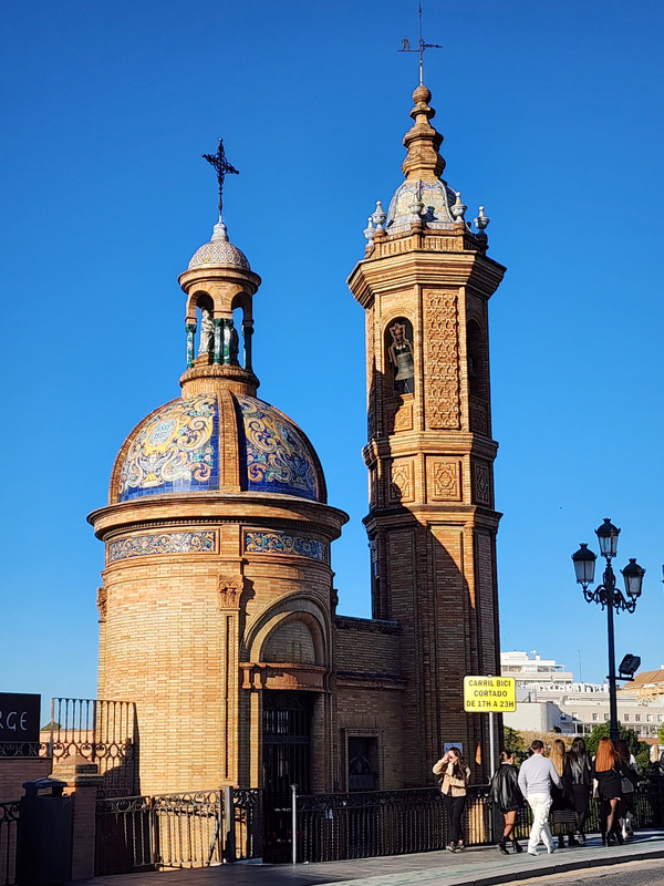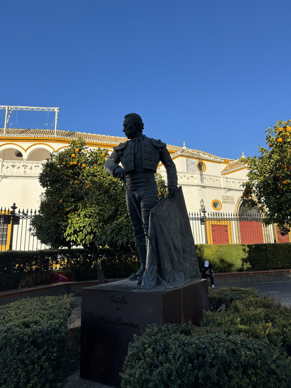 午餐时间到了。我们从横跨在河上的伊莎贝尔二世桥上河对岸的特里亚纳区Triana,这里到处是酒吧餐馆,与河东形成了完全不同的特色。这里是弗拉门戈舞的诞生地,就在桥西岸还有一处雕像,应该是最早开创弗拉门戈舞的人。随意进入一家街角的饭店,美味的龙虾饭让我们大块朵颐。带着没有吃完的面包沿着河畔散步,我们又在街上喂鸽子,身上的阳光暖暖的,喜欢闲逛的就来特里亚纳区。