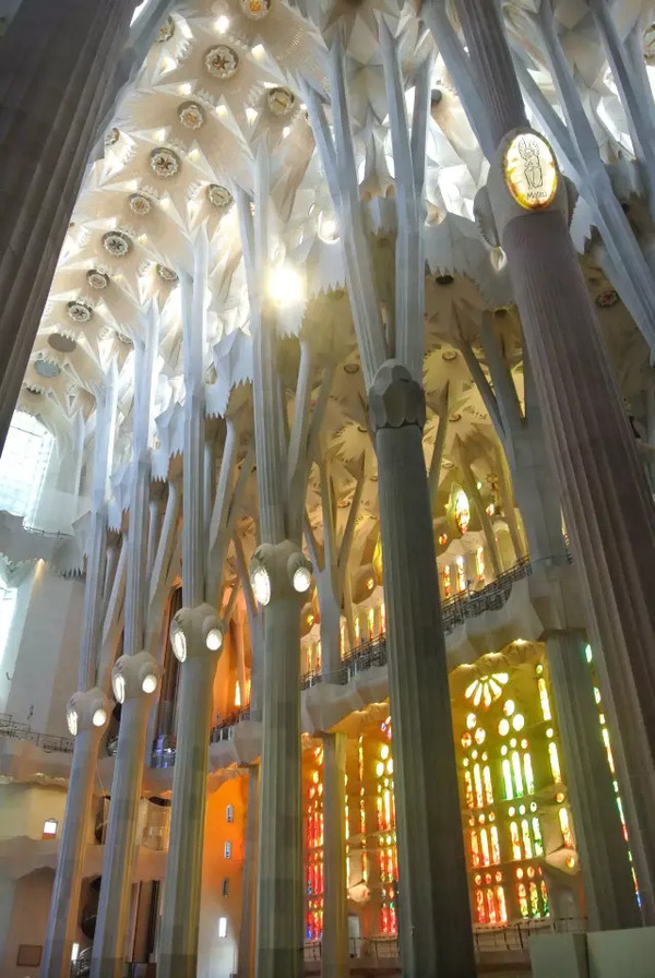 圣家堂是一座天主教大教堂,一般的教堂顶部的塔是方形的但是圣家堂是圆形的。圣家堂有三个立面分代表诞生,受难与荣耀,每个立面四座塔代表耶稣十二宗徒。内部还有六座塔分别是圣母玛利亚,耶稣还有圣经四福音书。教堂主体被成千上万精致的雕像所覆盖,远看如同泥巴粘上去的似黏土的物体其实都是石头雕刻的。灵感来源于圣经,大自然中的动物与植物。高迪不光借鉴了大自然的元素也运用了诸多数学物理原理。例如整体的构架竟然是用许多麻袋吊在绳子上错综吊出的抛物线设计出的,光是建筑草图就令人惊叹不已。能够登顶的楼梯也是螺旋形状灵感出自蜗牛壳。高迪既注重整体又在乎细节,教堂的彩绘玻璃也是抽象图案,颜色统一渐变,这使阳光照进来无比温和。圣家堂可以写的细节太多了,实际上用文字又写不出来,所以只有真正亲临现场才能感受到它的震撼之处。