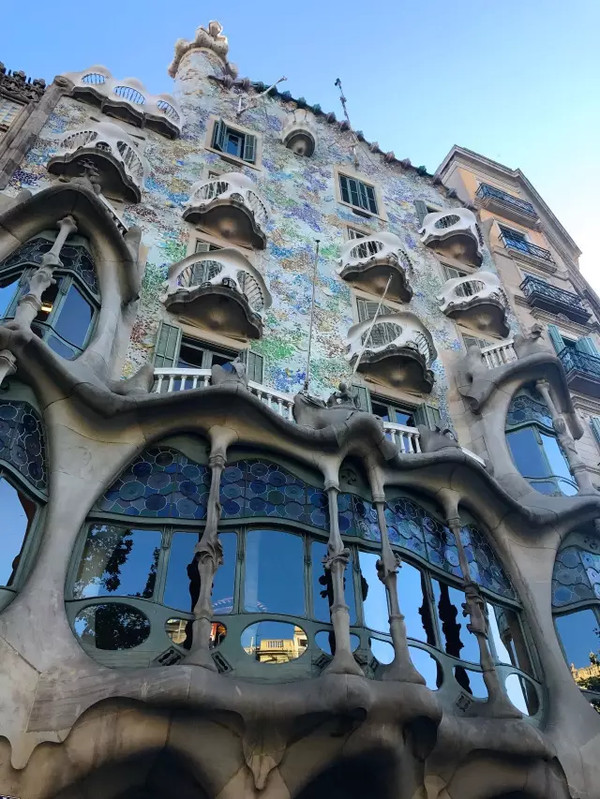 巴特罗之家,像童话一样,灵感来源于一个加泰罗尼亚传说:在塔拉戈那省地区的山上有一恶龙,专吃人兽。人们为求太平,每年向它献祭一个牺牲者。有一天,这个不幸降临到堡主的女儿头上。堡主的女儿十分美丽善良。恶龙得知后便威逼堡主要将其女儿作为祭品献给它,就在恶龙准备接收这份‘祭品’时,英俊骑士乔治出现了,他上山与龙恶斗,在4月23日这一天终于屠龙,解救公主。巴特罗之家整个的设计灵感就出自这个故事。房屋整体是巨龙的身子,房顶是龙的脊背。房顶的小阁楼据说是公主,而阁楼之下有一个伸出来的杆子,那就是圣乔治杀龙的剑。巴特罗之家是在某街区连排房屋最把角的位置,总共六层。每个窗户外的小阳台都像是巨龙的鳞片。颜色五彩缤纷像是巨龙在阳光下的颜色。外观的墙壁出现来高低建筑的另一大关键词----碎瓷砖,在巴特罗之家的墙壁、天台都能看到用打碎的瓷砖拼贴来做装饰的装修风格。