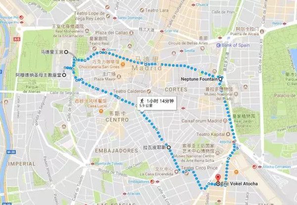想赶着太阳微弱的时候开始摸索城市,其实只要走在阴凉地儿,体感最多25°,于是就这样凉爽地暴走了4个多小时。马德里共有1962座古建筑,其中包括阿尔卡拉门、西比勒斯大桥、太阳门或哥勒斯宫这样的标志性建筑,这些古迹也使马德里成为一座真正的博物馆型城市,是世界上唯一一座半径为100公里的城市。当然我们没有跟着历史遗迹有计划的走路,反正走哪儿算哪儿,悠闲自在。