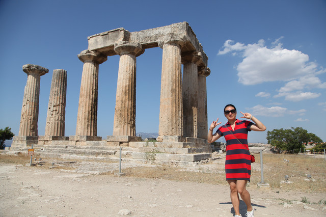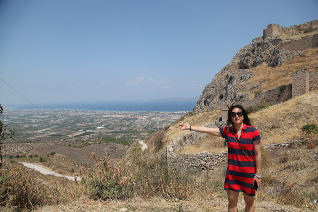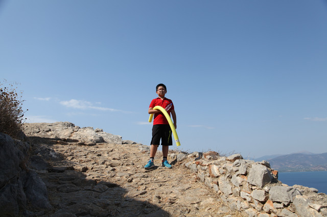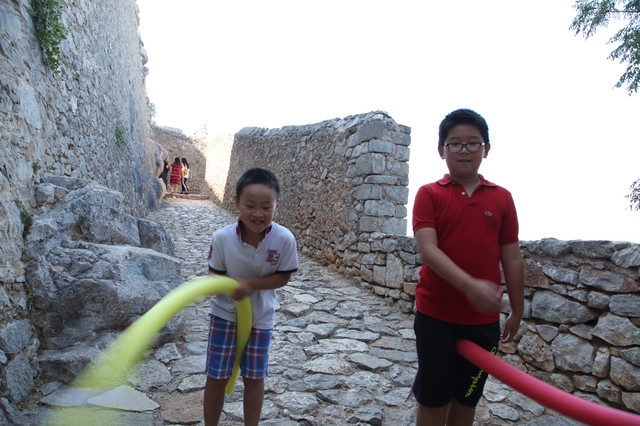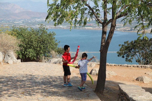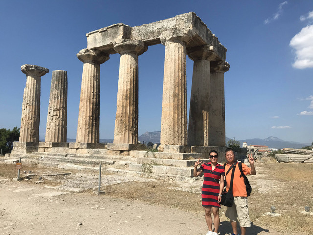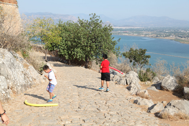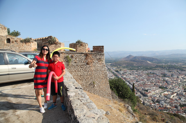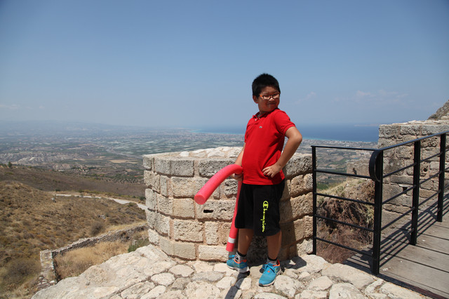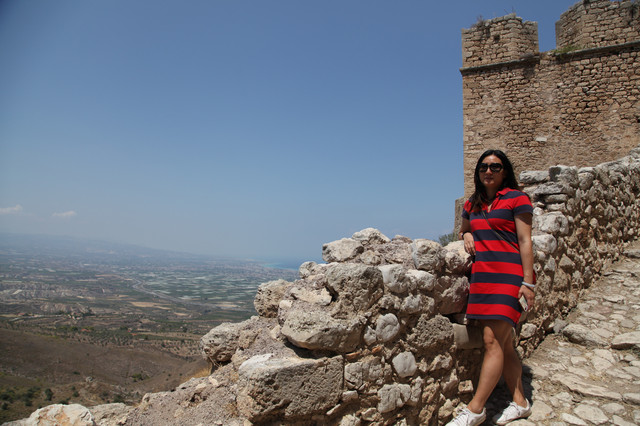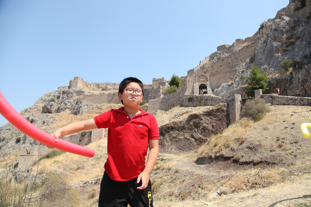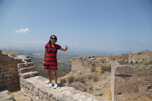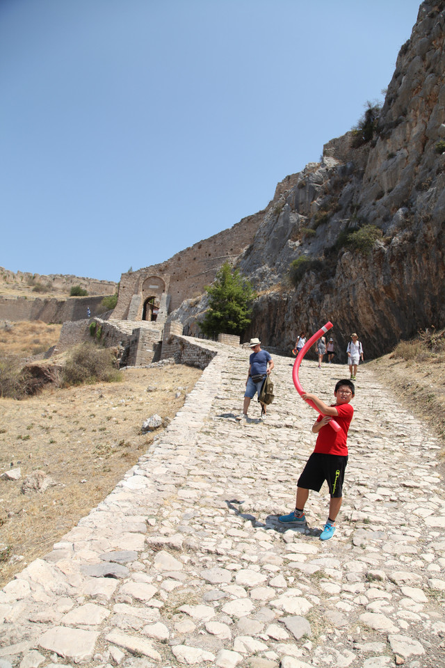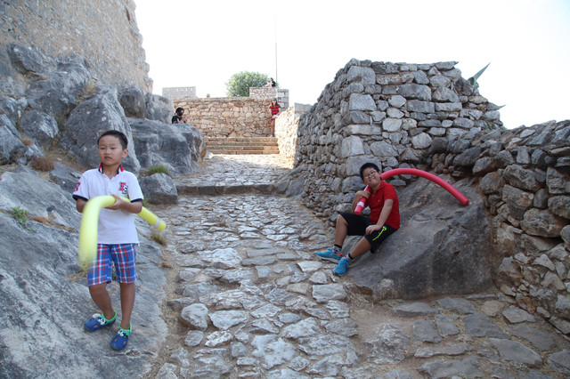 随后,我们马不停蹄地驱车直奔科林斯卫城。它位于古科林斯南面的一座山巅上,是古希腊的天然关隘屏障之一,站在这里可以俯瞰周边开阔的城镇景色,一览风光无限的海上美景,科林斯卫城有许多经典古建筑,其中最负盛名的当属圣保罗教堂、科林斯考古博物馆等。Keith对这种枯燥单一的石头城古迹兴趣不大,加上当日气温接近40度,孩子们都不肯爬山去看古堡,只剩下大人们还在坚持。