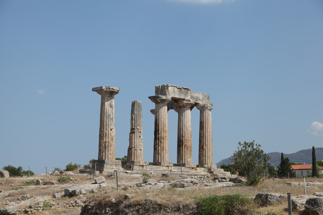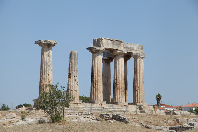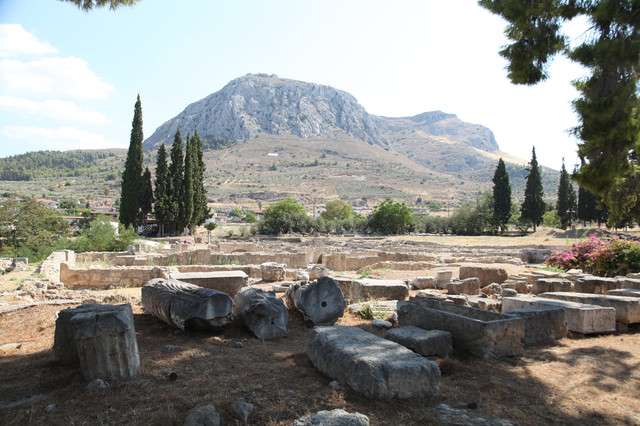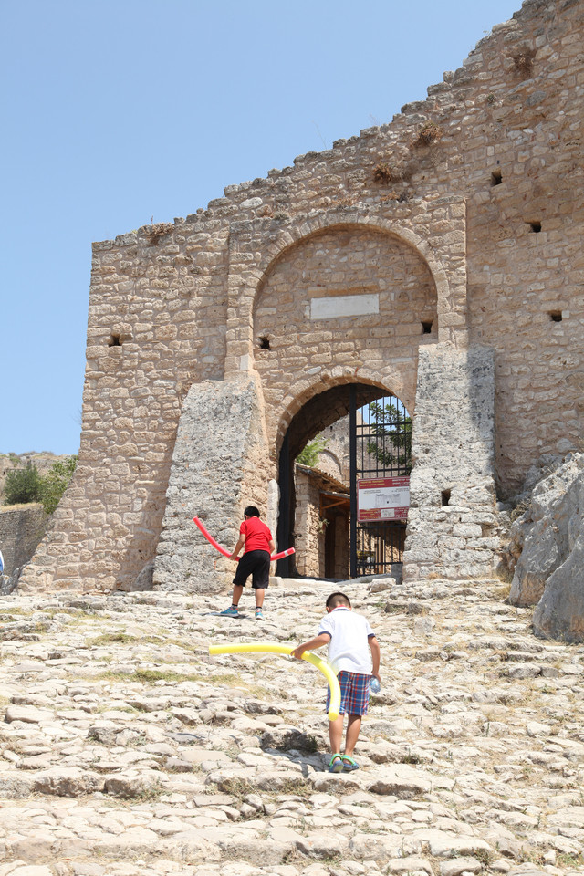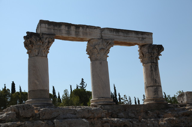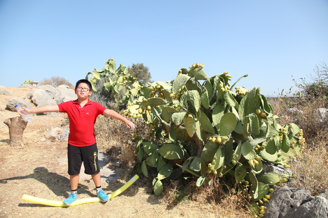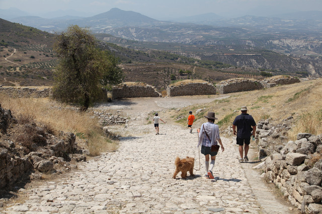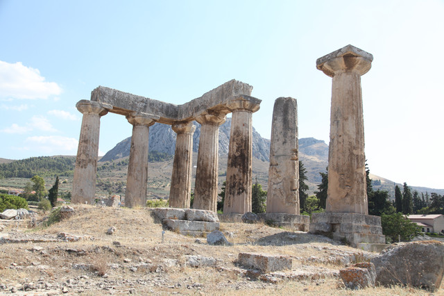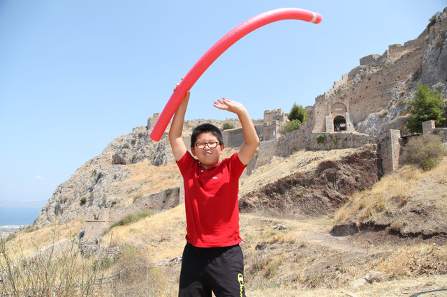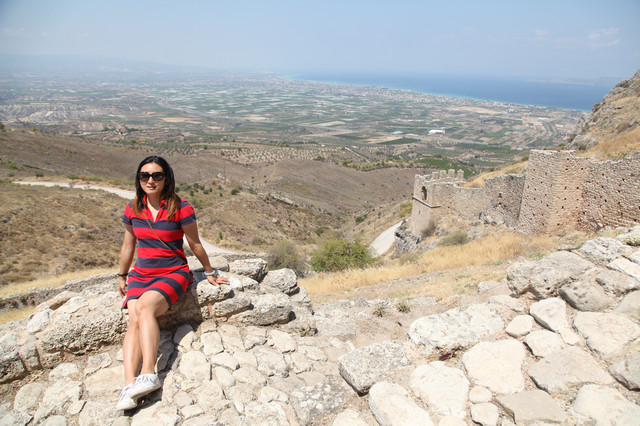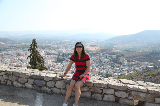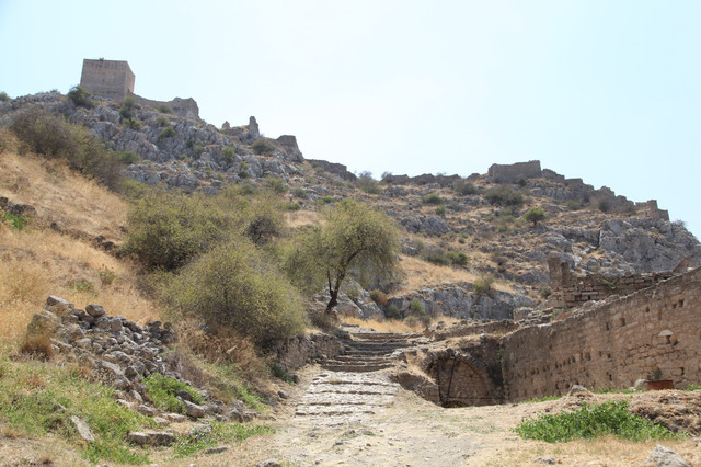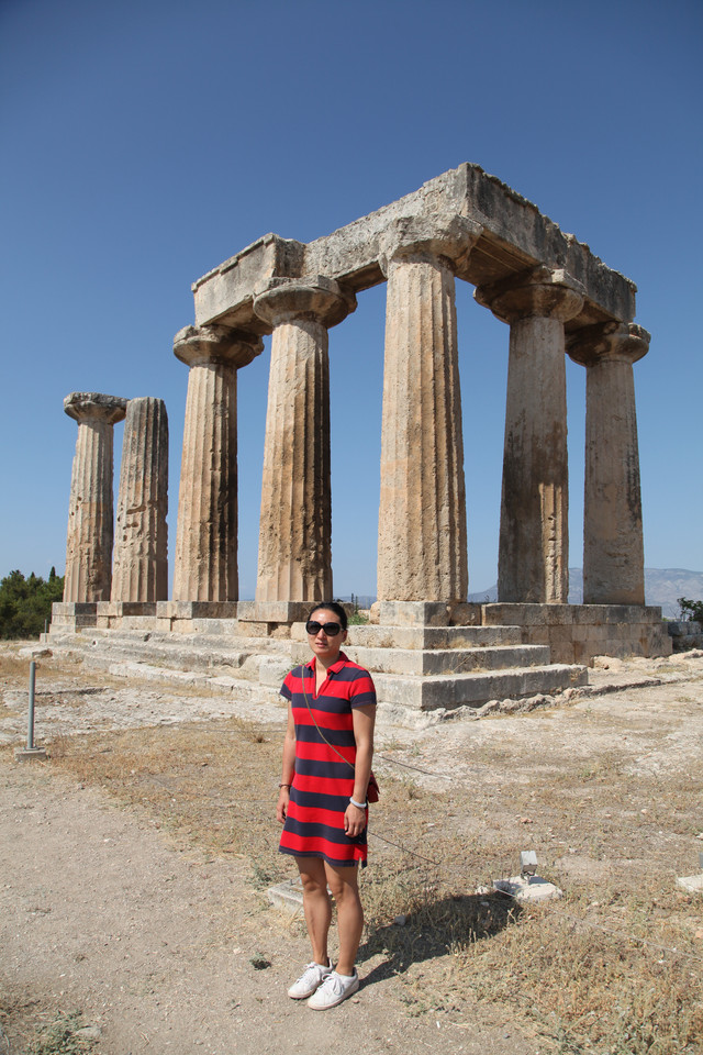 随后,我们马不停蹄地驱车直奔科林斯卫城。它位于古科林斯南面的一座山巅上,是古希腊的天然关隘屏障之一,站在这里可以俯瞰周边开阔的城镇景色,一览风光无限的海上美景,科林斯卫城有许多经典古建筑,其中最负盛名的当属圣保罗教堂、科林斯考古博物馆等。Keith对这种枯燥单一的石头城古迹兴趣不大,加上当日气温接近40度,孩子们都不肯爬山去看古堡,只剩下大人们还在坚持。