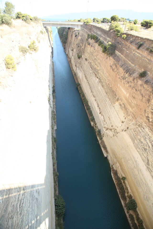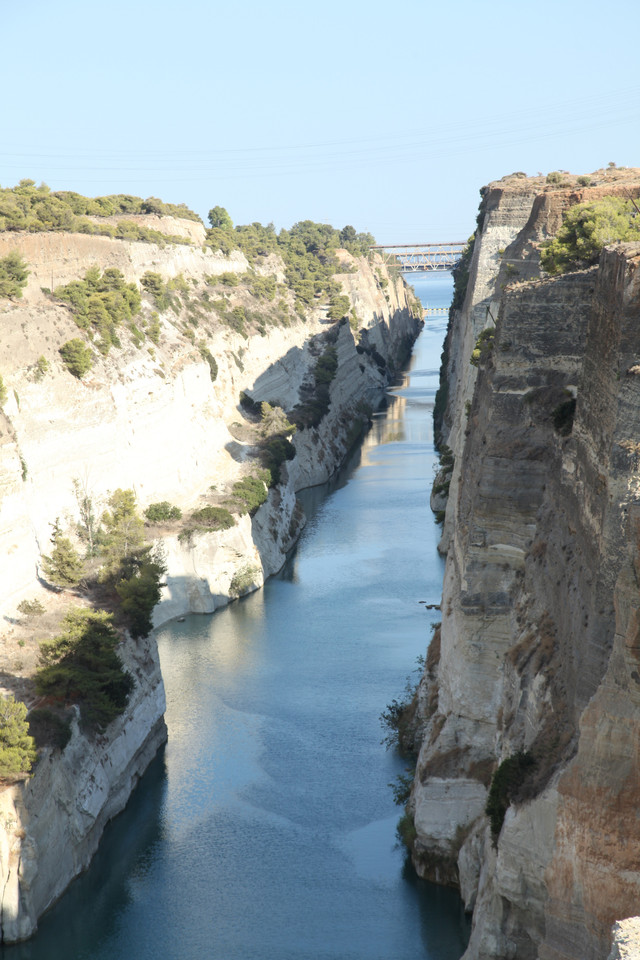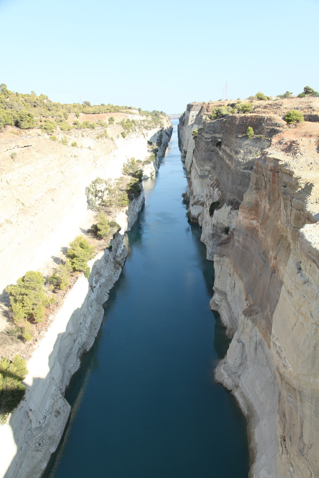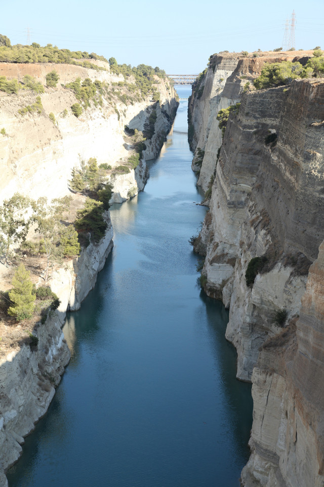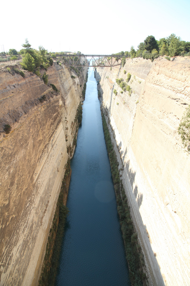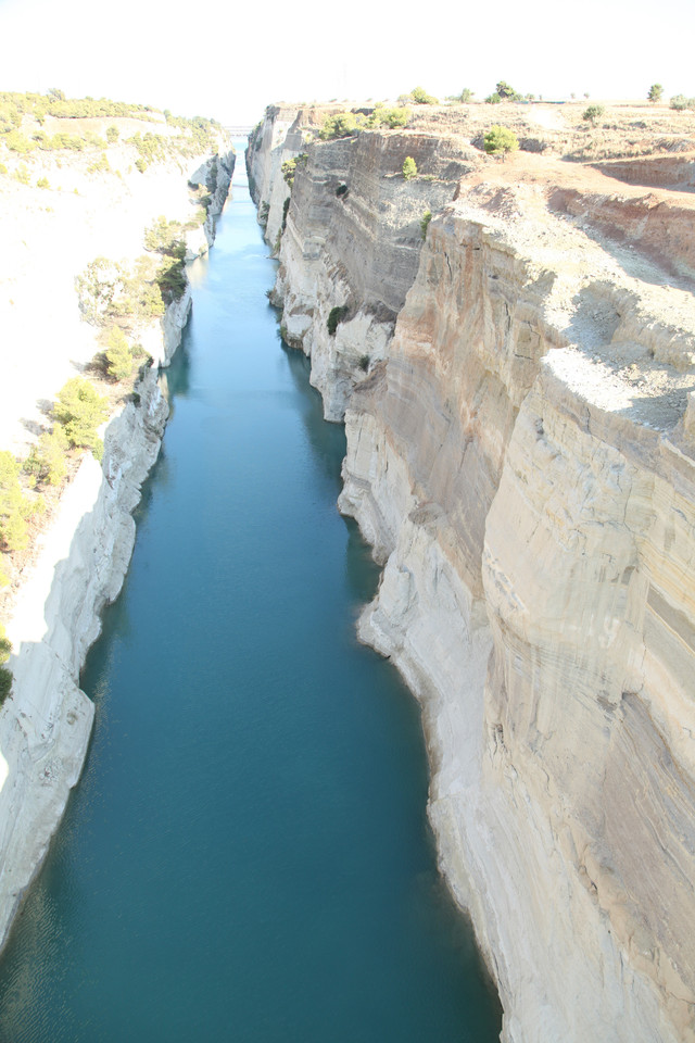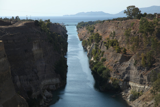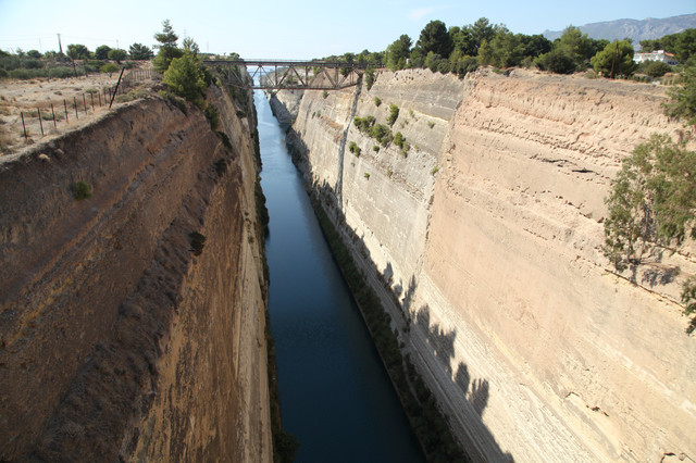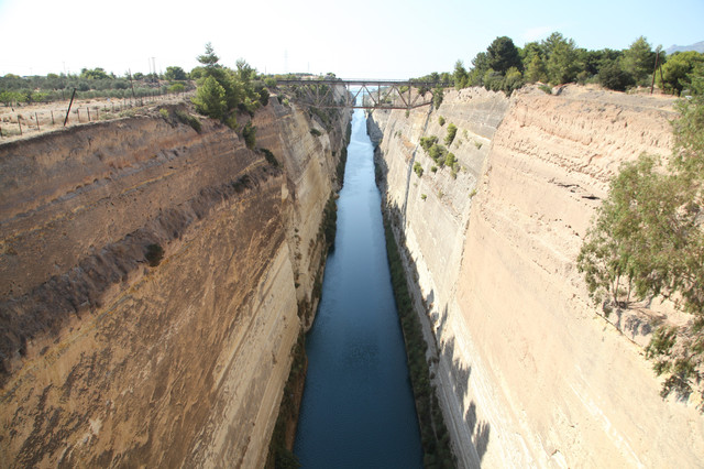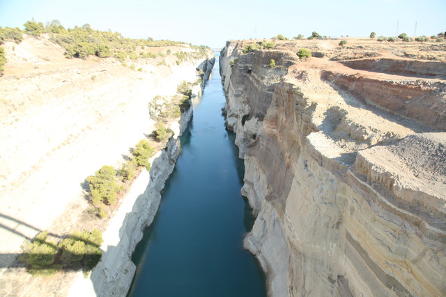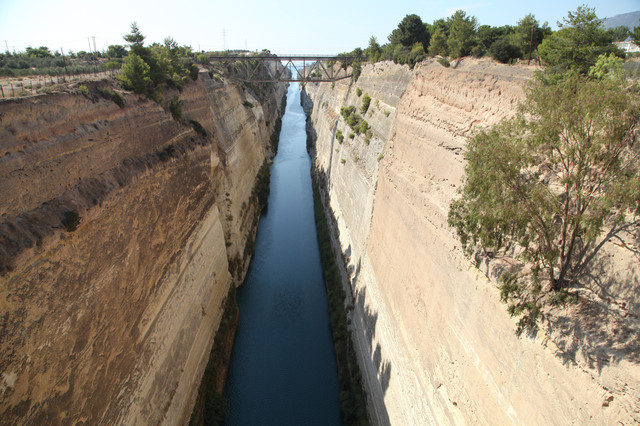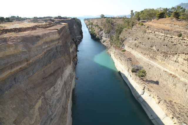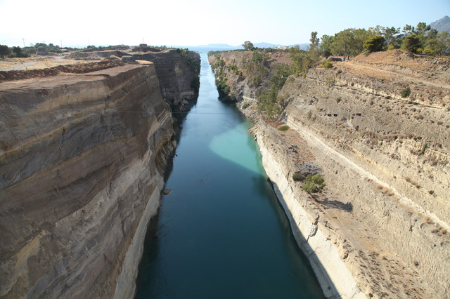 科林斯运河是世界上为数不多,在坚硬的岩石区开凿出的运河,站立在横跨运河的大桥上,俯瞰运河,只见两岸坚硬的高石灰岩壁,十分陡峭,运气好的话,你会碰巧看到一艘游船在狭长而陡峭的岩壁中行驶,从地面到运河水面深达90米的纵深,惊险刺激,给人遐想无限。