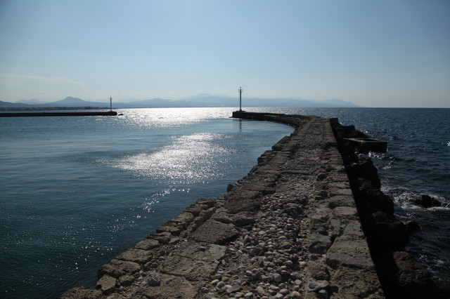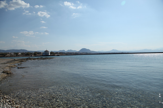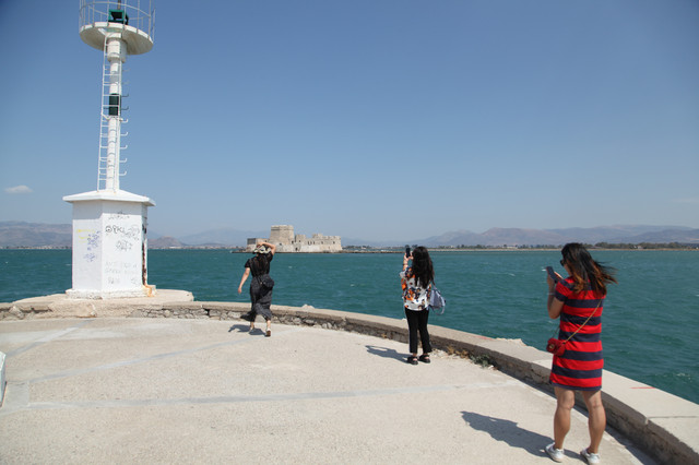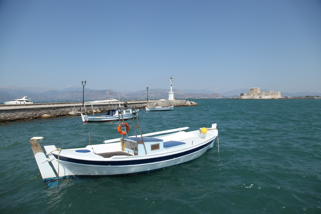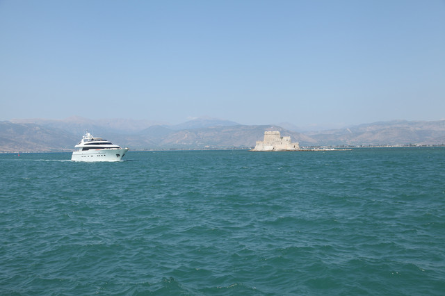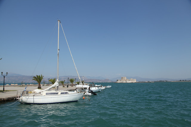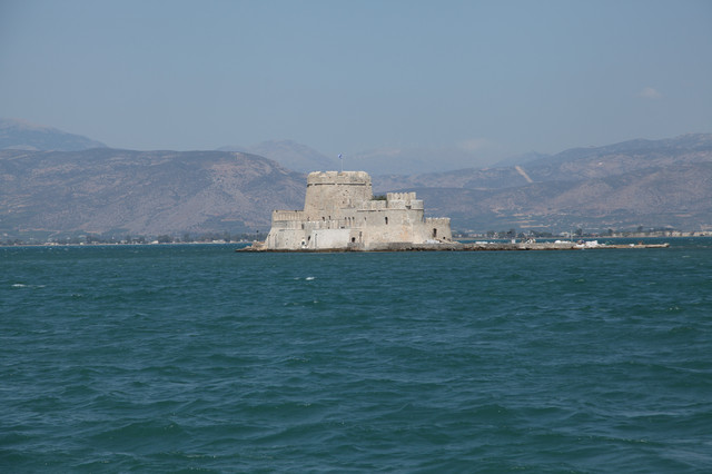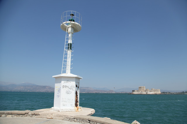 出得城堡,下到山脚,沿着街道小巷,我们步行来到毗邻布尔齐城堡的海滨,不远处浅白色的布尔齐城堡,掩映于蔚蓝的大海中,静静地躺在风光旖旎的纳夫普利翁镇海港的怀抱里。
