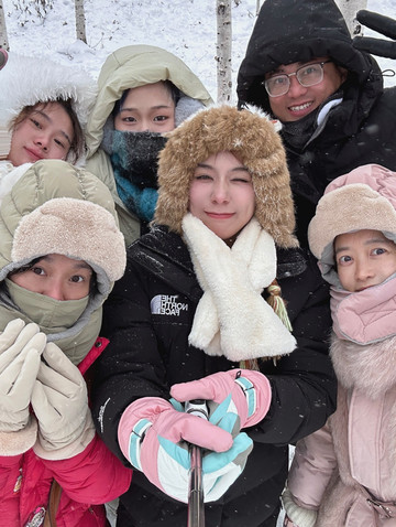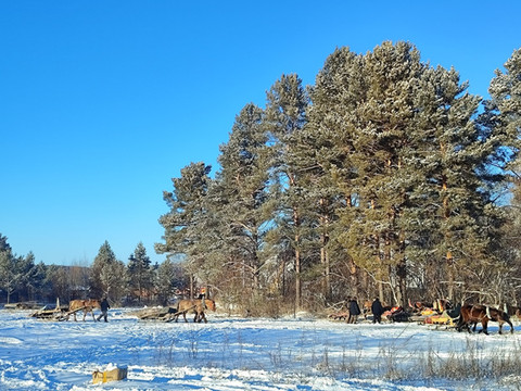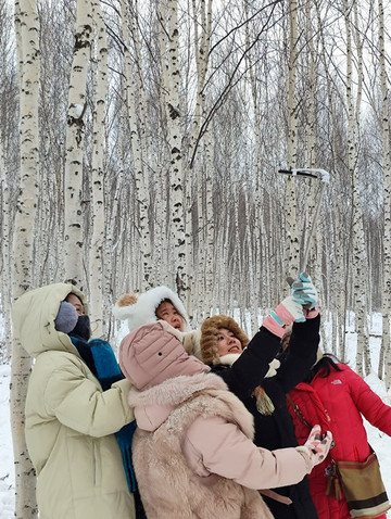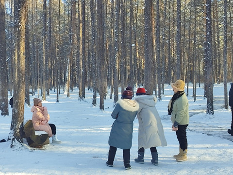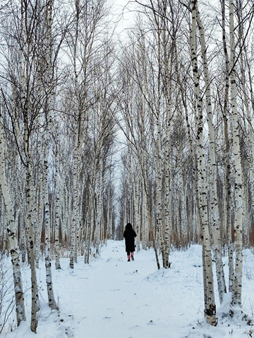 从 北极 村出来,直接前往白桦林,密密的白色白桦树干,还有地上厚厚的白色积雪,走进去一个穿着鲜艳颜色服装的人,特别出片。这里的雪积得蛮厚,每踩下去都感觉能听到明显的嘎吱声。团里的小伙伴冒着寒冷,泼雪玩,还有合照。