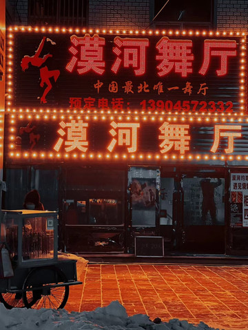 -漠河舞厅-8点出发,回 漠河 县城。11点左右到 漠河 县城啦。一路嗑瓜子聊天,很快到达。到了先去 北极 星广场打卡,再去附近的药店买药,还有去特产店买特产。张姐送两个小姐姐去火车站,剩余4人去 漠河 舞厅,就我一个显眼包,跟别人蹭了首西楼儿女,还独唱了首水中花,原来国语版更有冬日意境。舞厅没人跳舞,打卡的年轻人很多, 20块/人。