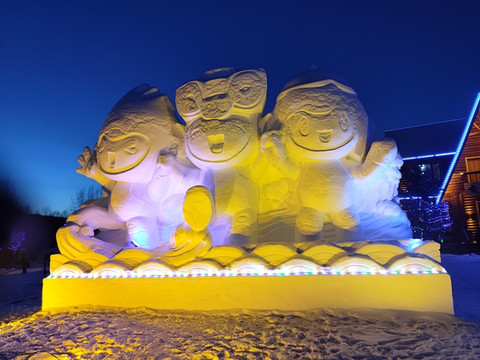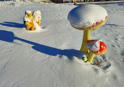 一行三人,城中闲逛。窗台的大松果,地上的冻鱼,冰雪中略显呆萌的小雕塑,宁静美好。