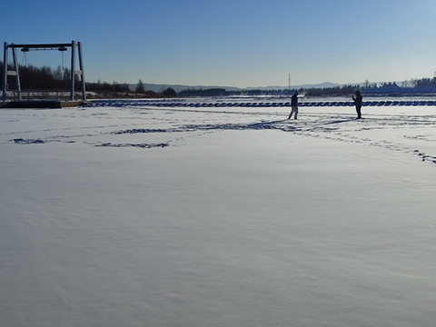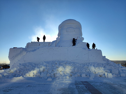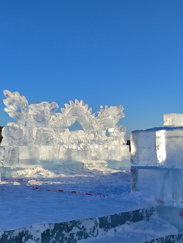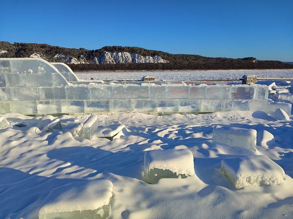 出门溜达,村里的 北极 广场,工人们正在 黑龙江 畔做冰块城墙,冰块几十公分厚,问大哥,说是就地取材,从远处河道裁割后再运过来。