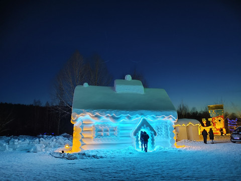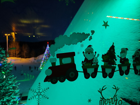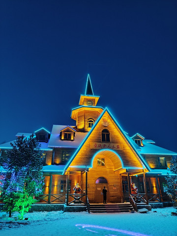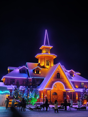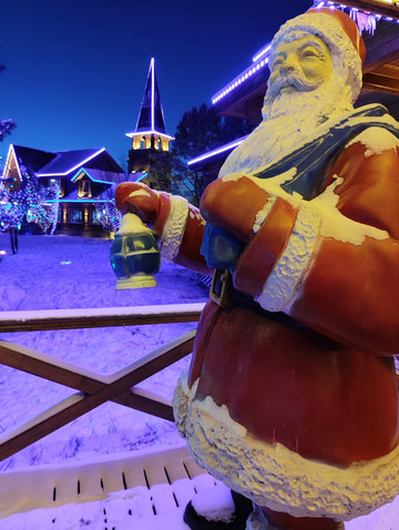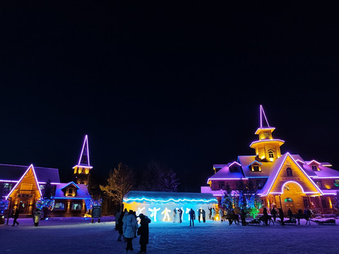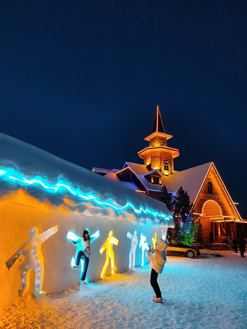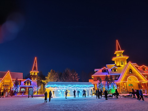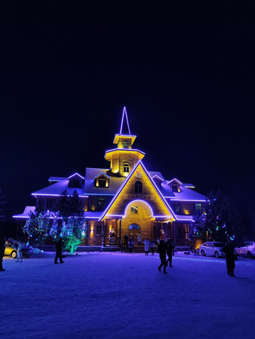到圣诞村,天色渐晚,冰天雪地里,几栋木屋子霓虹灯闪烁,五光十色映衬着这片白色世界,有点梦幻。