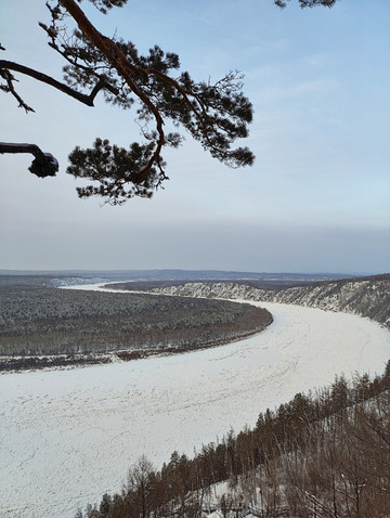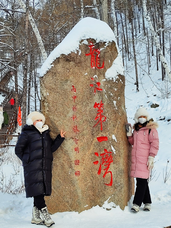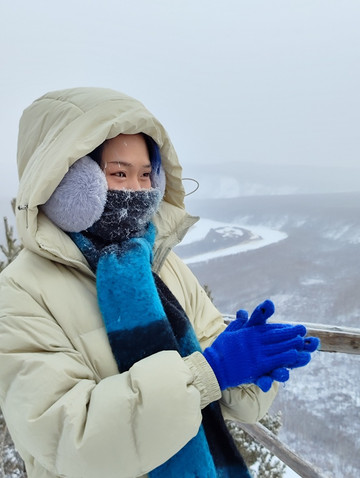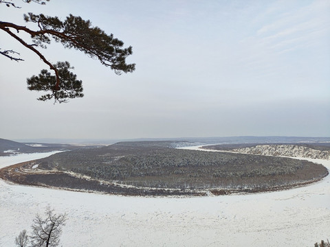 这里需要登上几百级木栈道台阶才能俯瞰这个河湾,团里有三个小姐姐放弃了,还剩下三人登顶。不容易的,这趟也是费体力的,毕竟冰天雪地地爬台阶登山,是蛮辛苦的。 黑龙江 到这里拐了个 大湾 ,凹凸镶嵌,自然弧度之美。有鹰击长空,这天寒地冻的也出来盘旋觅食,真的佩服生存在这种气候下的动物。