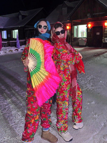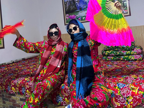回民宿,七七和阿丁已变身大花袄翠花了,还匆匆跑雪地拍照,引领 东北 潮流时尚啊。