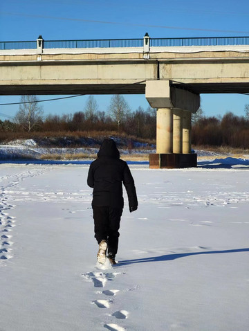 到河边踩雪玩。河面结冰,又有10多公分的积雪,够好好玩一会了。徒步跨河,踩雪一次性踩个够。
