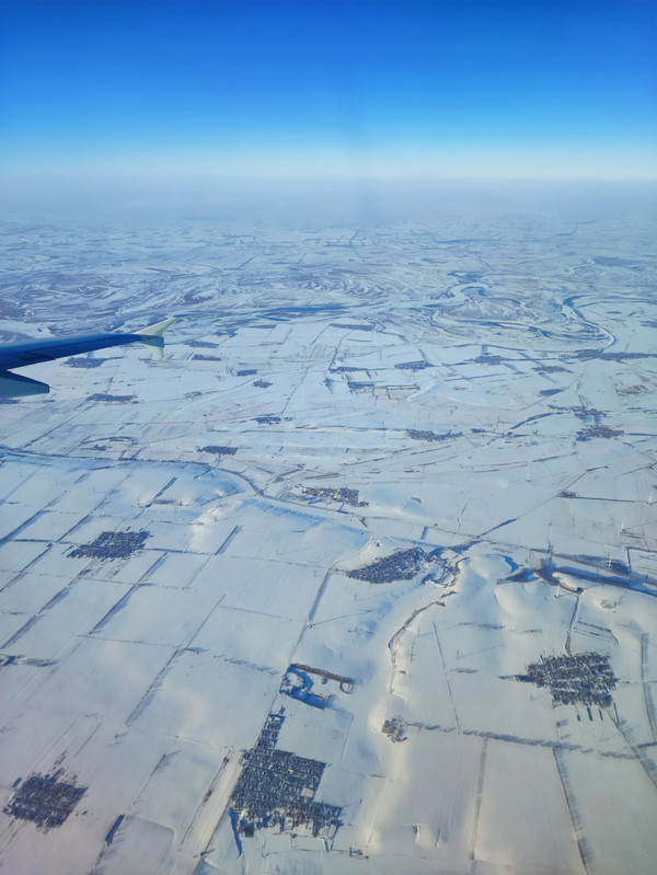 2点多的飞机飞 漠河 , 哈尔滨 起飞后,景观让人激动啊,北国风光,千里冰封,万里雪飘,这真的是冰雪世界,一路拿着地图定位看过去, 肇东 市, 绥化 市, 海伦 市,山口水库, 五大连池 市等,全是白茫茫一片啊,一个个小村庄散布在这片白色世界,田地则都覆盖了软绵绵的一层雪,瑞雪兆丰年,希望明年这里也是 大丰 收啊。