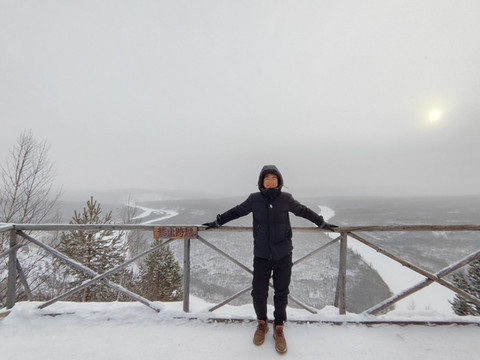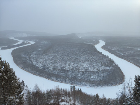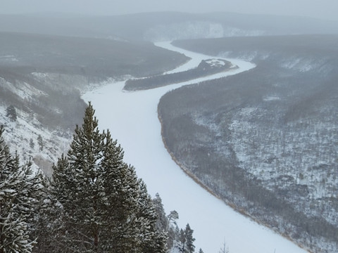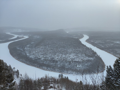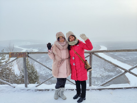 女脚湾,视野很开阔,居高临下俯瞰整个河湾,白茫茫的一片,还下着雪。下雪的冬日,俯瞰这条蜿蜒盘旋的冰雪河流,感受国度最北的肃杀冷气,够了够了!