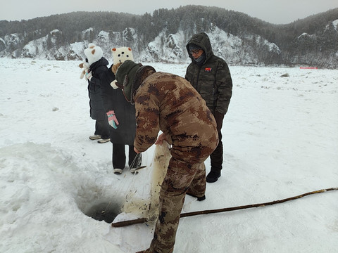 去 黑龙江 看冬捕,其实也就是去看个稀奇,两个大哥提前在冰上凿好窟窿下了网,然后每次客户过来就把网扯起来给大家看看,确实网住了一些小鱼,看完又把网放回去了,可以等下拨客户了,哈哈,绿色环保(手动狗头)。拼团,200元看一次。