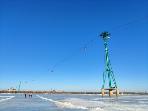 步行到松花江,都结冰了,有不少冰上娱乐,滑冰的,抽陀螺的等,好热闹,还有跨江缆车。天气是真冷啊,但是喜欢玩的小伙伴也是真抗冻啊。