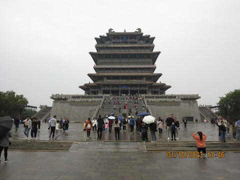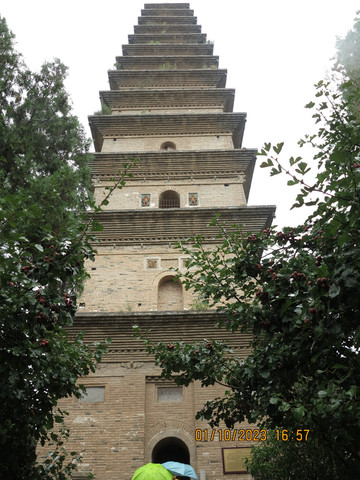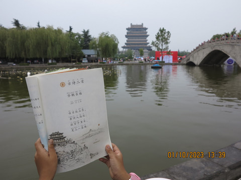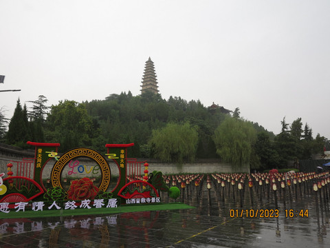 下一站去大名鼎鼎的鹳雀楼。天上开始下雨,这里确实人多,好在秩序还算好,停车场顺利停车,吃了永济的牛肉水饺和扯面。这里陕西山西游客有优惠,号称秦晋之好,感觉蛮友善的。老婆买了鹳雀楼,大铁牛,普救寺以及晚上梦境西厢记的套票,非常划算。先登鹳雀楼,多年前和老婆来过这里,没啥人,今天带着宝宝和她的课本来打卡,下雨登楼,体会更上一层楼的感觉。