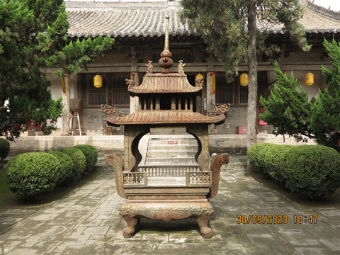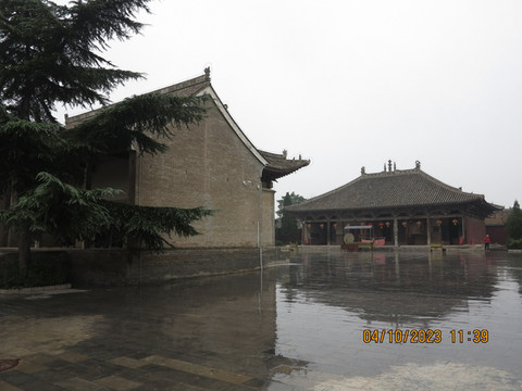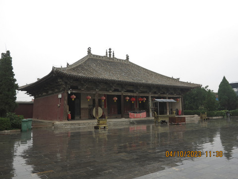 中间就是广仁王庙正殿,因庙内供奉水神,封号“广仁王”,又因庙前原有五龙泉,泉水从庙基前沿涌出,故又称:“五龙庙”。这里是中国现存三座唐代木构之一,但感觉没有南禅寺、佛光寺那么亮眼,感觉唐代元素不是很明显,不管了,学术问题交给专家,我们就是看看热闹。围着正殿,周围的区域设计还是很不错的,有介绍山西木构的,有宣传斗拱的,人也不多,非常舒服。
