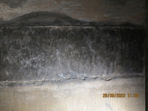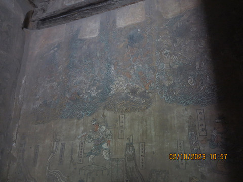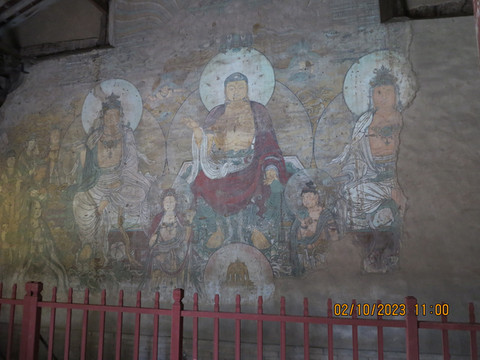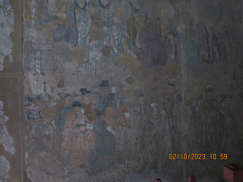 看完墓地去边上的青龙寺,这里的壁画非常出名,据说是永乐宫画师的师爷画的。寺院不大,中殿和大殿都是元明建筑,两旁垛殿亦为元代遗物。各殿塑像一个不剩,但大殿、中殿和伽蓝殿内保存的壁画十分漂亮,值得好好看看。大殿壁画的主要是《佛说法图》,大殿壁画据南壁窗槛画工题记为明洪武十八年补绘或重装,只有西南隅少部分粉墨为元代印迹。中殿四壁为“水陆画”,是青龙寺壁画中的精华所在。
