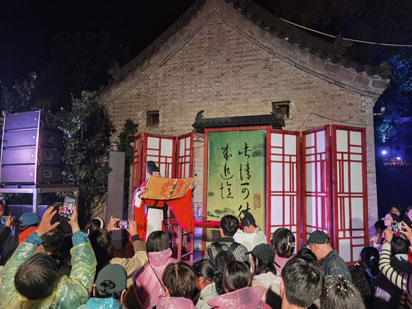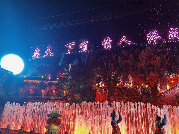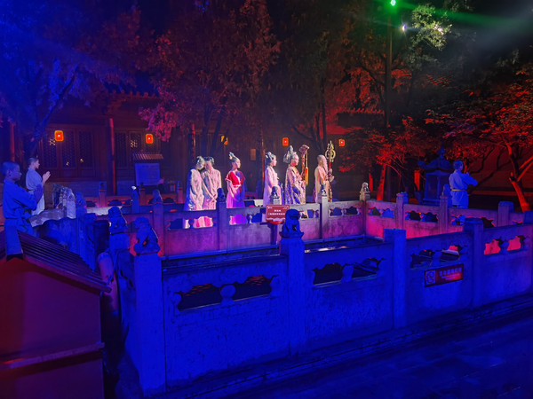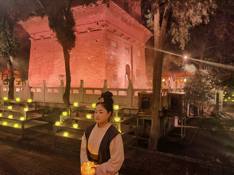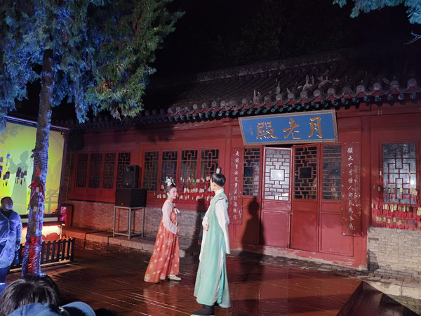 晚上的普救寺还是有点冷,梦境西厢记的演出准时开始,这是永济市倾力打造的大型行浸式夜游体验剧。游客和演员几乎零距离,从山门广场开始,一路往寺院里面走,跟着演员一路转场普救寺中十来个点,到每一个点演员会演出节目,整个演出还是非常不错的,把一部西厢记比较立体的展现出来。推荐一下,值得一看。