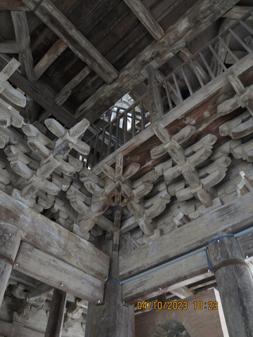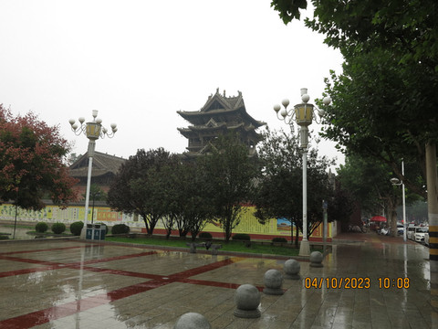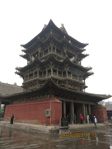 第八天:今天去万荣,天气下雨,万荣飞云楼人不算太多。这里属于万荣东岳庙,有着北塔南楼的飞云楼,尽管和北塔--应县木塔相比还是有不少差距,但依旧非常震撼。东岳庙就在街边,进门就看到了飞云楼。遗存的楼体是清代乾隆十一年重修后的形制,被誉为“中华第一木楼”,飞云楼外观三层,内部实为五层,总高约23米。通体显现木材本色。飞云楼是解店镇东岳庙内建筑群中的代表,民谚有“万荣有个解店楼,半截插在天里头”。
