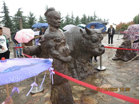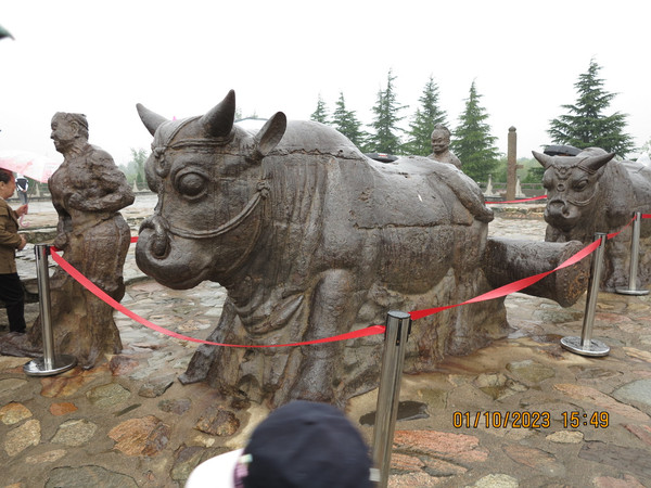 出鹳雀楼,不远就是蒲津渡遗址(黄河大铁牛),车确实挺堵,但停车场还是有序进入,大铁牛这里不要门票,这里是真的唐代遗址,这里是古代黄河上的著名渡口——蒲津渡历史上著名的蒲津桥和唐开元铁牛也位于此处。后因黄河东移,开元铁牛等没入水中,悄然消失。据说黄河两岸铁牛一共有八个,现在挖出来的有四个铁牛和铁人,而且这四个都是处于黄河古道东岸的,山西人比较实在,没有挖陕西的那几个。登上高台看铁牛铁人,由于下雨,居然有两个铁牛被穿上了雨衣。铁牛每个都有几十吨,关键下面还有铁柱深入地下,以前在下面展示馆可以看到铁牛的基座,但这次在维护没有看到铁牛的基座。