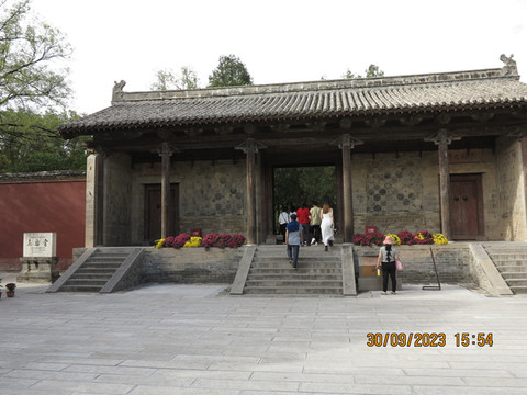 宋真宗御书《汾阴二圣配飨铭》(萧墙碑)号称是这里的宝贝,最后的秋风楼崇峻壮观,楼内藏有元至元八年(1271年)捐刻汉武帝《秋风辞》碑。楼下是古道,传说这条东西古道是战国时期的纵横家张仪出游列国时的必经之道,故称“张仪古道”。古道还立有纪念标牌“1937年秋,八路军经此古道,奔赴抗日前线。”当年八路军第115师、120师、129师三大主力在朱德、彭德怀等领导同志的指挥下,由陕西省韩城县芝川镇渡口登船,分批东渡黄河,在山西万荣县的宝鼎镇庙前村上岸。渡河登岸后沿张仪古道穿秋风楼,步行至侯马北上太行。