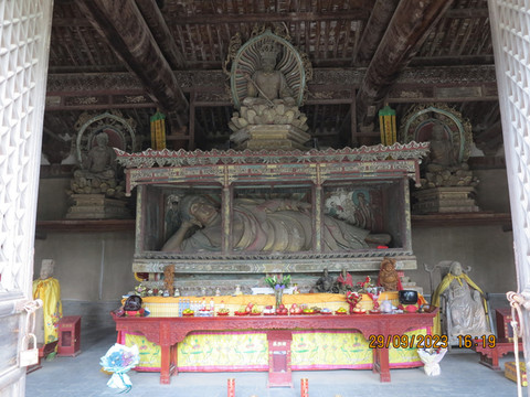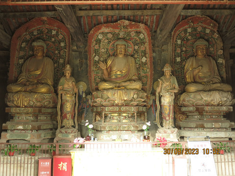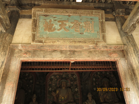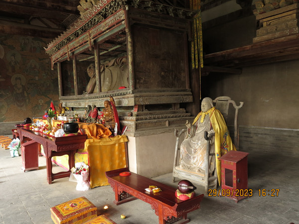 离开垣曲县,开始北上,直达绛县太阴寺,绛县是历史上中国的第一个县,先秦历史典籍中首次出现“县”这一名称,因此绛县有“天下第一县”之称。这里古迹丰富,太阴寺是赵城金藏的刻板雕印处,来看看。寺院就在马路边,不要门票,内部不算太大,大雄宝殿为金代遗构,寺内保存有木雕像,彩塑。这里有中国最大的独木雕卧佛:一尊躯长4米、独木金身释迦牟尼涅槃卧像,非常漂亮,木雕神龛内还完好保存有明代洪武年间绘制的一组吊唁壁画,据元代碑文记载,这是金大定二十年云公、法澍(佛龛西侧有其塑像)等重修太阴寺、补雕《赵城金藏》时雕刻的一尊佛祖涅槃像,同时雕刻的还有三士佛像。