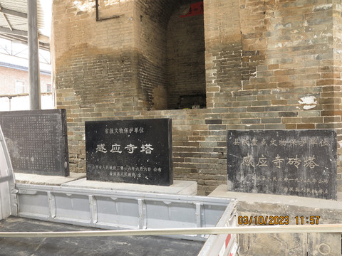 感应寺砖塔始建于宋代乾道元年(公元1165年),元代大德七年(公元1303年)因地震塔身破裂为两半。裂开之后就一直这样了好几百年直到今天,据说之前日军三光政策,要用炸药炸毁这个塔,结果只在塔身下方炸陷了一小部分,古塔整体岿然未动,只好作罢,确实厉害。
