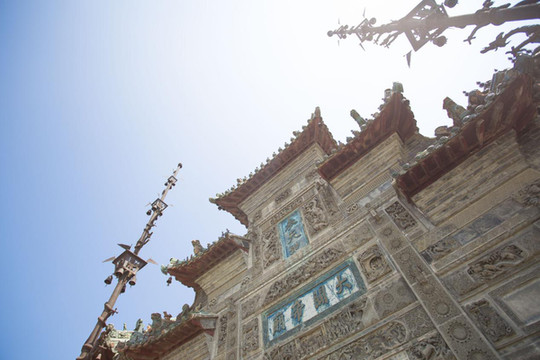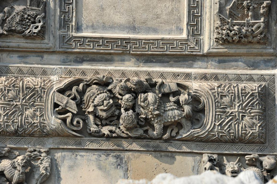 山门东侧为钟楼,西侧为鼓楼,三者相连形成一道水磨砖面的墙壁,墙上就是花戏楼的“第二绝”——砖雕。从这面墙的艺术价值来看,称其为“中华第一墙”也不为过。砖雕带有晋派微雕艺术的风格,寥寥数十平方米的水磨砖上,雕有52幅作品,共雕人物115个,禽鸟33只,走兽67只。里面的人物不论大小,皆神态各异,栩栩如生。题材基本是反映吉祥如意的缠枝花卉、福禄寿喜等图案,还有大量历史故事,结构严谨、线条圆润。用望远镜细细看去,只见2寸厚的砖上居然立体雕出7层的人物、故事、植物、野兽等图案,明显吸纳了徽派精巧玲珑、刀法严谨的雕刻工艺,可谓巧夺天工。