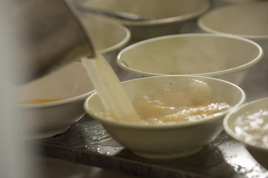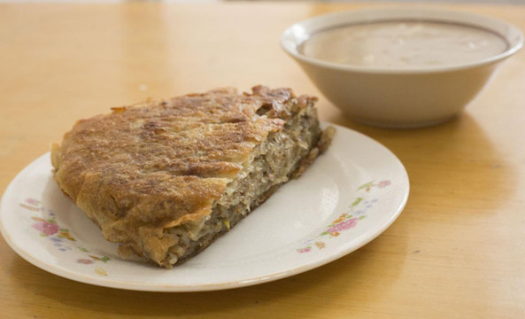 翌日,晴好。早出,觅食。远见小馆招牌上两个大字:脎汤,果断打卡。老板热情,边做边聊,原来这汤之名是乾隆的御赐,用老母鸡、猪排等为原料炖制而成,而后将生鸡蛋打在碗里并搅拌均匀,用沸腾的肉汤冲沏而成。据说乾隆皇帝下江南时偶尝此汤,大加赞赏,并欣然提笔写下脎汤二字,皇帝金口玉言,从此声名远播。就着脎汤,再来一个牛肉馍,这馍外层油亮、光灿,入口即发出脆响的声音,馍里的馅儿分多层,层层鲜嫩而不油腻,真是一个过瘾。