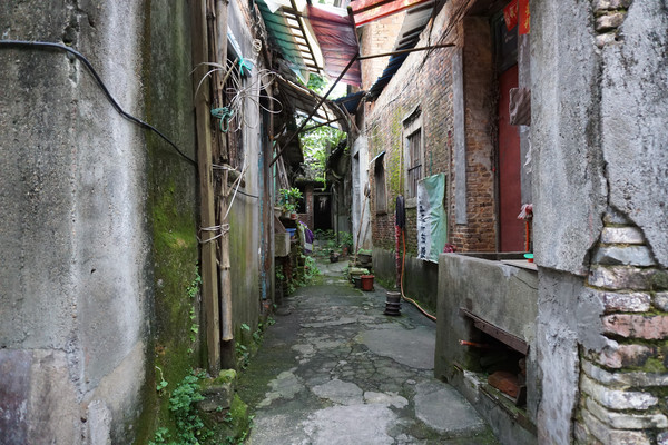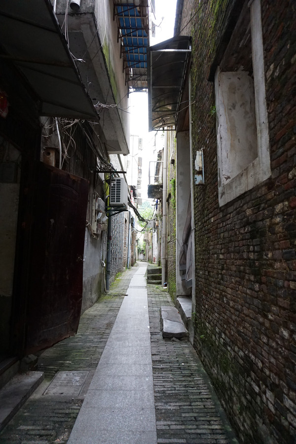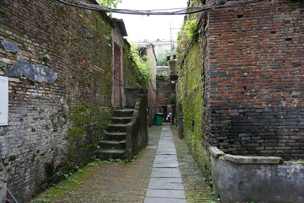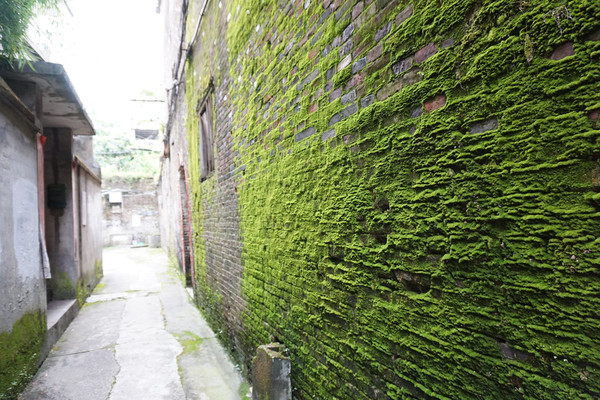 站在弄堂口观望,弄堂狭窄,中间是一块石板铺就蜿蜒进入,石板两侧是小砖叠砌而成。巷道曲径通幽,宽度狭窄,一般为2米左右,这是当时挑坯架的宽度为标准。因为弄堂狭窄,常年光照少,地面,墙壁上都长满了青苔。