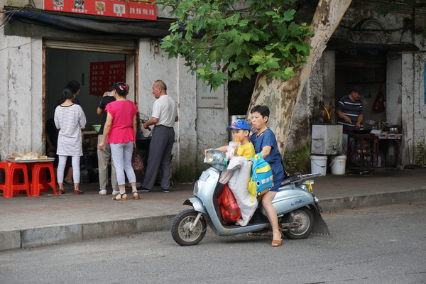 这一定是奶奶带着孙儿买早点,可爱白皙的孙儿手中高举着油条,微微回头将油条递到奶奶最合适的位置,奶奶咬下一口油条,踩下电动车带着孙儿离开。甜蜜幸福的爷孙图。