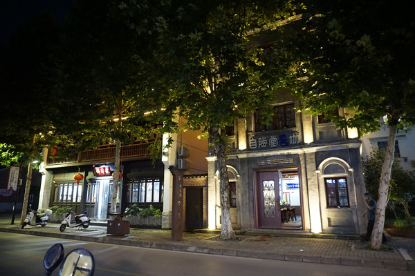 一栋栋建筑,有点类似于徽派,但也不尽相同。现在这些建筑都承担着现实的功用,这一家门楣上挂着红灯笼的是陶舍艺术酒店。