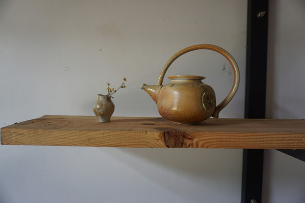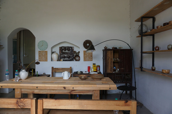 我们拾级踏入屋内,原来这里是一家陶瓷工作室。一进,房屋中间的一张木桌几张长条木椅质朴原味。