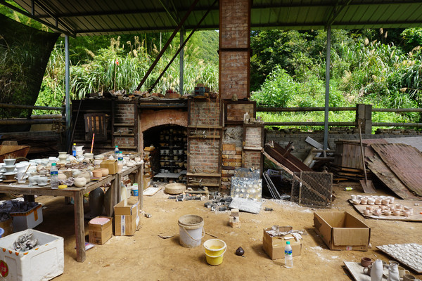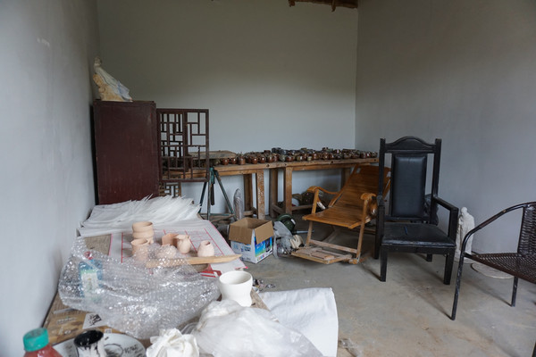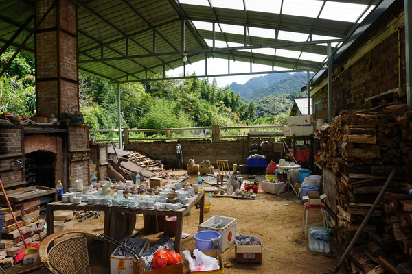 从这个角度就能看到柴窑中码放的各种作品。一栋民宅,两个院子,这间不大的工作室就完成了从原料,到翻模,拉胚,成型,烧窑的全过程。