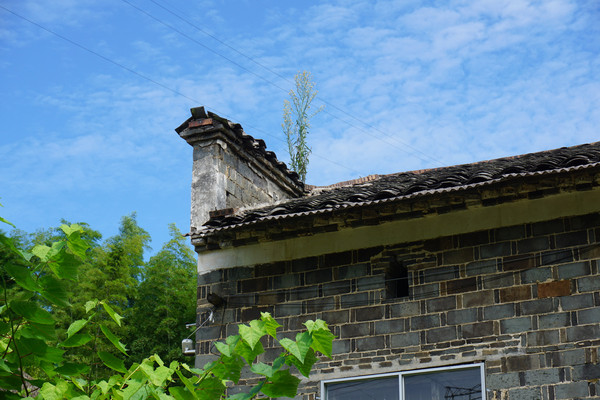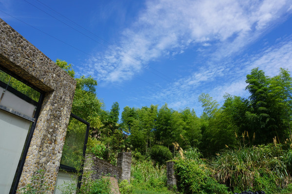 绿色的植被,蓝天白云簇拥着这栋青灰色的砖房很静穆的意境。