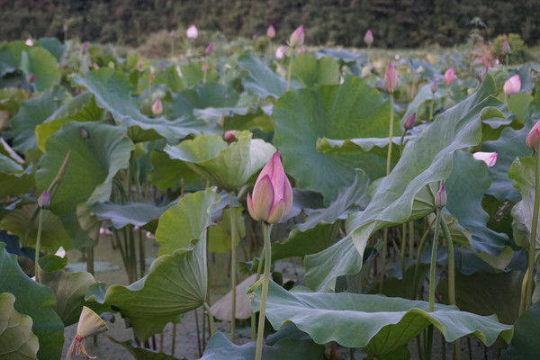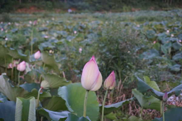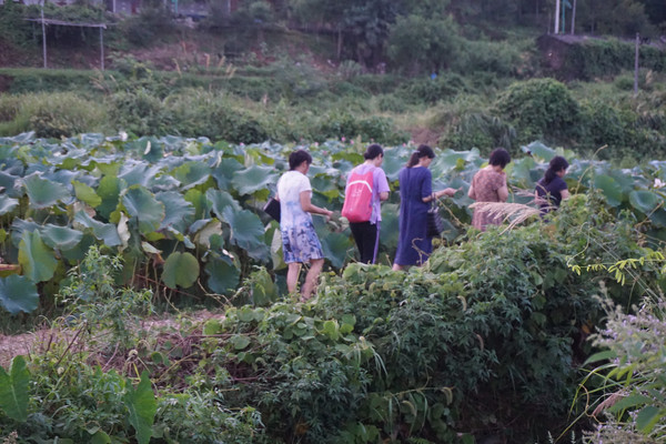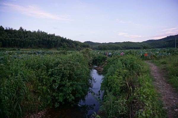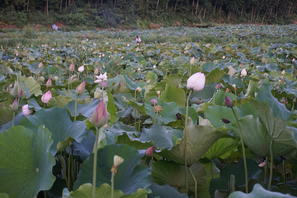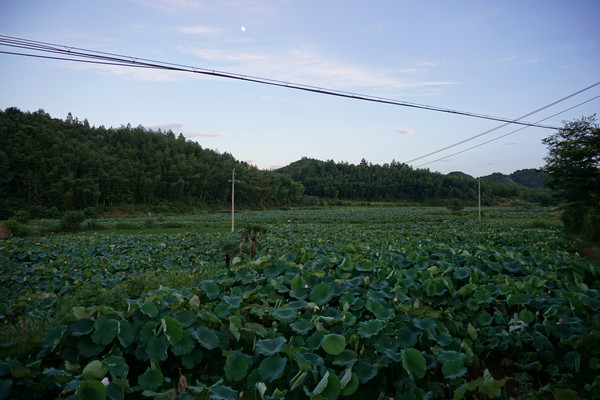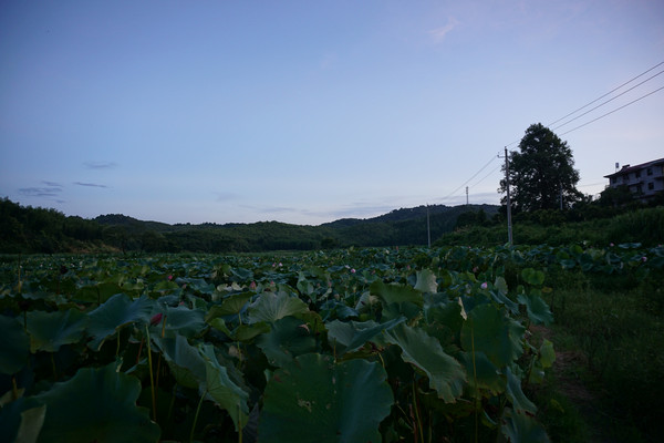 前两日就订好晚上去鱼山的同学那里用餐。因为事情耽搁了,出发时已经是下午五点多的光景。下班高峰,车速无法提速,等赶到同学处已经一个小时了。奇怪的是同学并没有招呼我们下车,只是让我跟着她的车前行。车驶离鱼山的主街拐进了山岭中。山路十八弯,六点多的山岭中能见度一下子就降低了,我注意力高度集中,紧紧的随着前面的车一点不敢大意。进入山中,山岭中的温度也比外面低好几度,倍觉清凉。车上的同学也不知道去哪?有同学说好像来过,是和同事一起来买莲子。稀里糊涂的跟车而行。黄昏,山显得更加深沉,路显得更加幽静,在这条路上行驶更加神秘。就这样弯曲旋转中开了十公里的山路终于在一村中停了下来。我满心的疑惑,也没人告诉我这是要到哪里?我以为同学带我们来吃农家乐。但好像也不对,她们齐刷刷一起就往田里走。原来这里是一大亩的荷园。我打开地图才知道这里的身份是景德镇市百荷园种养农民专业合作社。这个合作社是一家以从事荷花种植、观赏、莲鱼立体养殖、观赏瓜果种植、休闲垂钓、农家土灶体验为主的休闲观光农业经营实体。